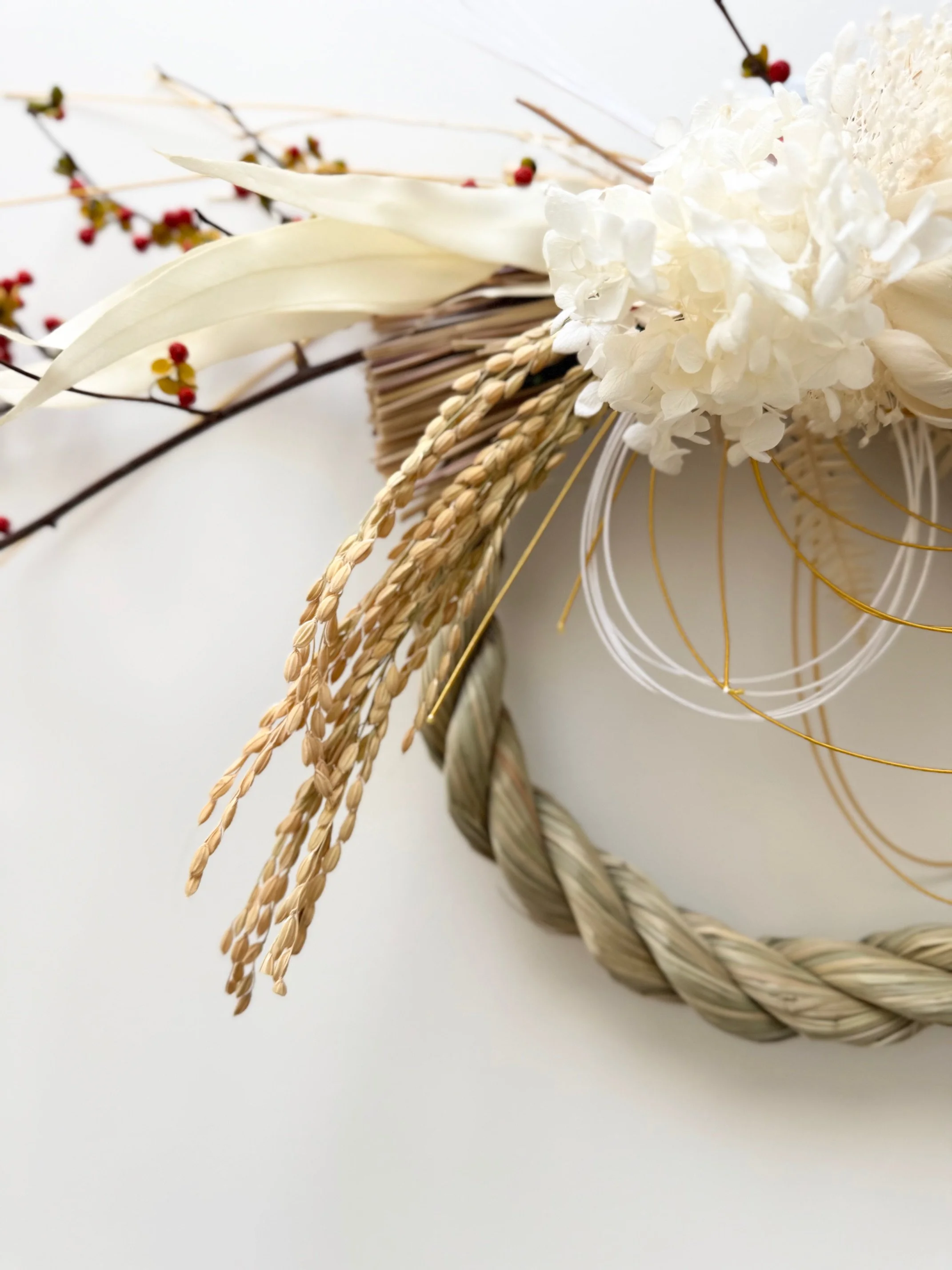 Shimenawa and Mizuhiki cords are specially imported from Japan, ensuring an authentic experience. The Shimenawa wreath itself will measure approximately 9 inches/22cm in diameter, but the overall size will be larger once you add your floral arrangement, which will vary based on your design.